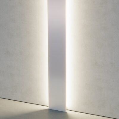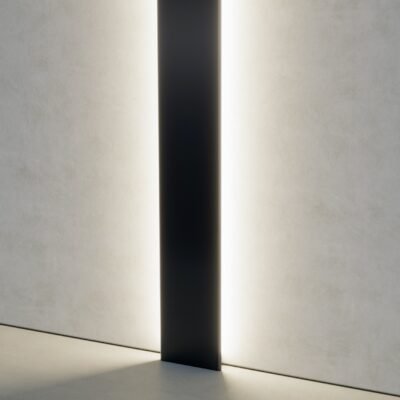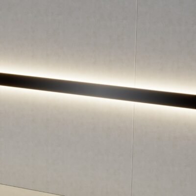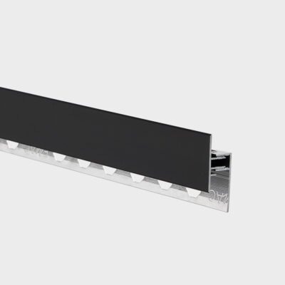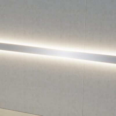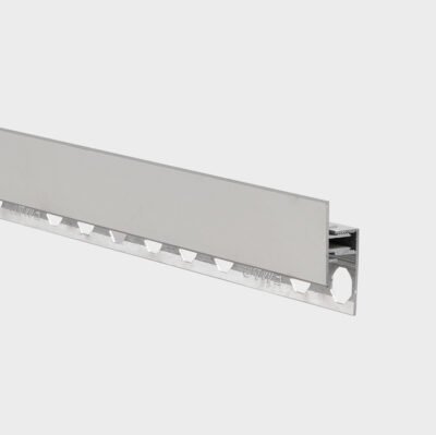 Su geometría, con perfil embellecedor clipado, está diseñada para la colocación oculta de tiras LED hacia la pared, dejando que la iluminación fluya a ambos lados del perfil y generando un innovador efecto de cortina de luz.