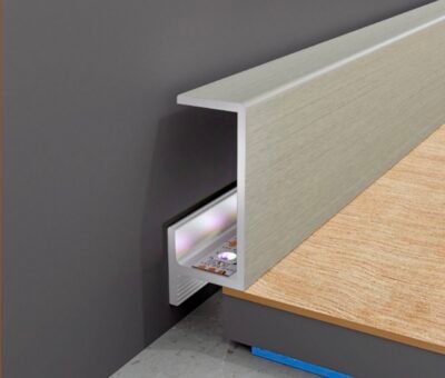 They can be installed on any type of flooring: parquet, laminate, SPC, tile, or marble. The only precaution when laying the flooring is to allow a minimum expansion gap of 3 mm around the perimeter and a maximum of 10 mm/13 mm. The profiles can be used on floors with a minimum thickness of 5 mm.
