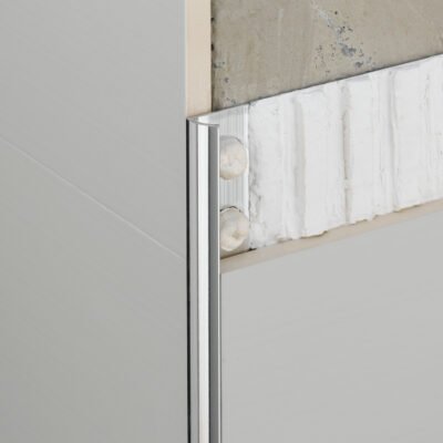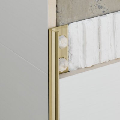 Perfil de esquina exterior de aluminio para azulejos que sirve para rematar, decorar y proteger la esquina exterior de la pared. La instalación se realiza simultáneamente con la de los azulejos cerámicos.