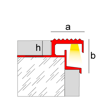 Perfil para peldaño Novopeldaño Eclipse – perfil de escalera de aluminio, con instalación simultánea con revestimiento cerámico y posibilidad de instalar iluminación con tiras LED