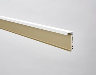 Innovador rodapié bicolor de pequeño tamaño, fabricado en aluminio, que potencia el efecto de pared suspendida una vez instalado.